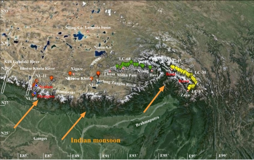 青藏高原的隆升是晚新生代以来全球气候变化的重要驱动因素,同时,也强烈影响了亚洲季风系统的形成和演化。基于目前在青藏高原使用的古高程定量恢复的方法,如: 氧同位素古高程计( 包含热动力学模型和经验模型)、△47 古温度—古高程计、氢同位素古高程计、古植物古高程计( 包含共存分析法、叶相分析法)和古环境分析等,青藏高原定量高程的研究取得了初步的成果。然而,在青藏高原古高度估算中,形成两种不同的观点在尖锐地争议中:其中一个观点是青藏高原到晚中新世的才开始快速隆升并达到目前的高度;另一个主要基于稳定同位素的观点,就是主张青藏高原在印度-亚洲碰撞的早期阶段开始形成并在早第三纪或中新世达到其现代高度。在争论的热点伦坡拉地区, 基于哺乳动物和花粉化石研究的早中新世古高度,要比古土壤碳酸盐和湖相灰岩稳定氧同位素以及叶蜡正构烷烃氢同位素值恢复的古高度结果低1000米。因此, 应用多学科多种高度计综合恢复青藏高原古高度,相互校正,尤其通过现代过程研究,确定和校正气候变化、纬向变化和气团变化等其他因素的影响,以更加可靠的估算青藏高原不同地区古高度变化历史。 高原南部水汽来源水汽来自孟加拉湾和阿拉伯海,并且主要从 85°~95°E一带中的喜马拉雅山中部的某些有利地区涌上高原, 以及从地势较低的高原东部和东南部地区的雅鲁藏布江河谷等地进入高原。中国科学院青藏高原地球科学卓越创新中心方小敏研究员课题组、青藏高原研究所白艳副研究员研究小组选取从喜马拉雅山南坡(1660~5050 m, 代表喜马拉雅南坡气团),以及组合代表雅鲁藏布江雅鲁藏布江气团的察隅~波密(ZB; 1468~4800 m) 和八一~拉萨高度断面(BL; 3050 ~ 4970 m),分别建立了各断面表土和植物叶蜡烷烃δDwax、河水δ18O 和δD值的高程递减率,探讨各断面气候参数、传输距离和纬度等主要因素对δDwax及其高程递减率和表观分馏值εwax-p的影响程度。结果表明:虽然在各断面δDwax值及其高度关系有变化,但是,整体上藏东南地区高度仍然是δDwax值的主控因素,其高程递减率为−2.2‰/100m (R2= 0.78; n=76)。而且,喜马拉雅南坡以及高原南部δDwax 值和河水氢同位素(δDrw)之间的同位素分馏值(εwax/rw) 稳定在−99 和 –110‰之间(均值为–104.5‰),证明了河水(代表降水)同位素值的高度效应是控制喜马拉雅南坡以及高原南部δDwax 值高度变化的主要因素,证明δDwax值在这一地区可以作为极具潜力的古高度定量指标。然而,由于各断面气候参数、传输距离和湿气来源、纬度以及山形等因素的影响,不同断面同位素值分布及其高程递减率有明显差异,说明即使在湿润的高原东南部,青藏高原古高度恢复研究需要考虑这些因素的影响。 这一研究成果发表在Geochimicaet Cosmochimica Acta (doi.org/10.1016/j.gca.2015.08.016)上,得到了中国科学院战略性先导专项B (XDB03020100;稳定同位素高度计重建与古高度估算)和国家自然科学基金(41321061, 41071003 and 41371022)等,以及中国科学院藏东南高山环境综合观测研究站的支持。特别感谢与中国科学院青藏高原徐柏青研究员和田立德研究员多次的重要讨论,以及田立德研究员喜马拉雅南坡河水数据的支持。