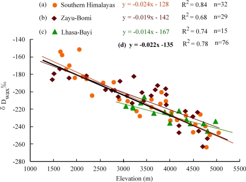 图2. 喜马拉雅山南坡,以及察隅~波密和八一~拉萨三个高度断面表土叶蜡烷烃δDwax的高度关系.