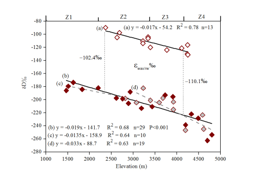 图3. 喜马拉雅山南坡断面河水δDrw (橘色空心圆点)和表土叶蜡烷烃δDwax (橘色实心圆点) 的高度关系.