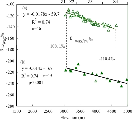 图5. 八一~拉萨高度断面河水δDrw (绿色空心三角)和表土叶蜡烷烃δDwax (绿色实心三角) 的高度关系. |