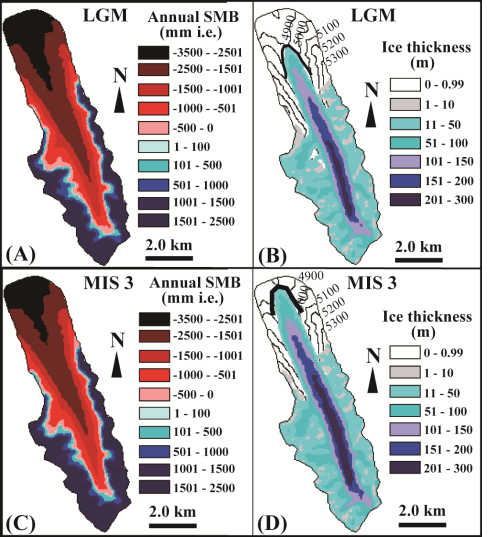 图2. LGM和MIS 3时期冰川物质平衡和冰川规模