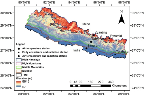 近期,中国科学院青藏高原地球科学卓越创新中心、青藏高原研究所马耀明研究员课题组(尼泊尔籍博士生Pukar Man Amatya为第一作者)利用改进的地表能量平衡方程与MODIS卫星资料和相关的地面观测资料,首次计算得到了喜马拉雅南坡尼泊尔地区的地表能量通量分布、季节变化及2003至2013年的变化规律,并利用2012年8月起在Tarahara地区架设的整个尼泊尔第一套大气湍流观测系统的观测资料对计算结果做了验证。研究结果显示:(1)尼泊尔地区能量通量分布与其地面的结构特征一致,且计算值与观测值的误差在10%以内;(2)尼泊尔地区不同季节的地表热通量分布特征有很大差别。在海拔较高的高喜马拉雅地区,感热通量占可利用能量的主要部分,而低海拔的其它地区,潜热通量占可利用能量的主要部分;(3)从2003到2013年的11年期间,喜马拉雅山南坡尼泊尔地区地表净辐射有增大趋势、感热通量总体有减小趋势(中部地区略显增加)、潜热通量总体有增加的趋势(中部地区略显减少)。