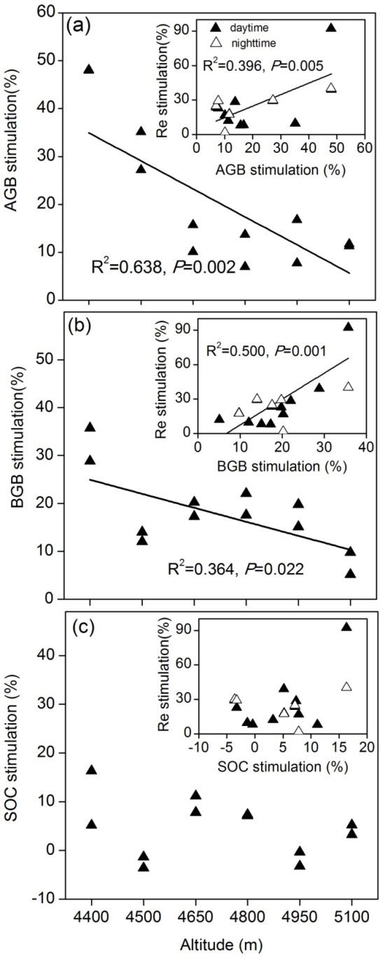 图2.七年围栏禁牧导致的地上、地下生物量和土壤有机碳的变化率随海拔的变化趋势及其与生态系统呼吸变化率的关系。