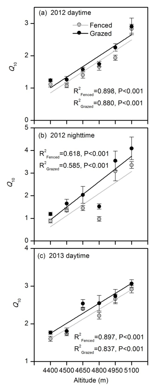 图3.围栏内、外生态系统呼吸的温度敏感性差异及其随海拔的变化趋势