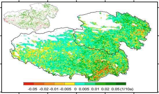 图一, 1982-2010年植被变化趋势。由生长季NDVI的变化趋势表示,NDVI增加表示植被增加。左上角小图中绿色和红色部分分别表示植被显著增加和减少的区域。
