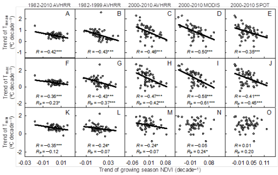图二,植被活动变化(横轴)对局地温度变化的影响。图顶端表示不同的时段和NDVI数据集。R为生长季温度(平均温度Tmean,日间温度Tmax或夜间温度Tmin)变化趋势和NDVI变化趋势之间的相关系数。第二行中RP为Tmax变化趋势和NDVI变化趋势之间的偏相关系数,控制变量为Tmin变化趋势;第三行中RP则为Tmin变化趋势和NDVI变化趋势之间的偏相关系数,控制变量为Tmax变化趋势。