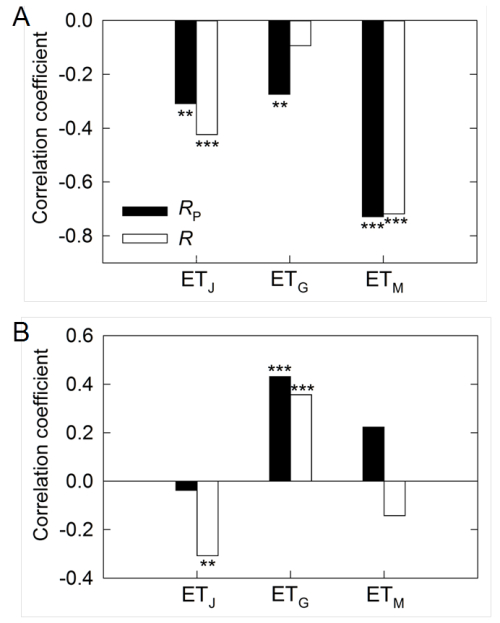 图三,蒸散(ET)变化对白天(A)和夜间(B)温度的影响,用温度变化趋势分别和来自于三套数据(ETJ, ETG, ETM)的ET变化趋势之间的偏相关系数(RP)表示。(A)R为Tmax变化趋势和ET变化趋势之间的相关系数;RP为Tmax变化趋势和ET变化趋势之间的偏相关系数,控制变量为Tmin变化趋势。(B)R为Tmin变化趋势和ET变化趋势之间的相关系数;RP为Tmin变化趋势和ET变化趋势之间的偏相关系数,控制变量为Tmax变化趋势。
