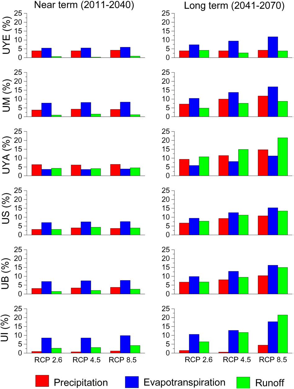 图1 青藏高原六大河源区降水、蒸发和总径流在近未来(2011-2040)和远未来(2041-2070)在各气候情景下相对于基准期(1971-2000)的变化