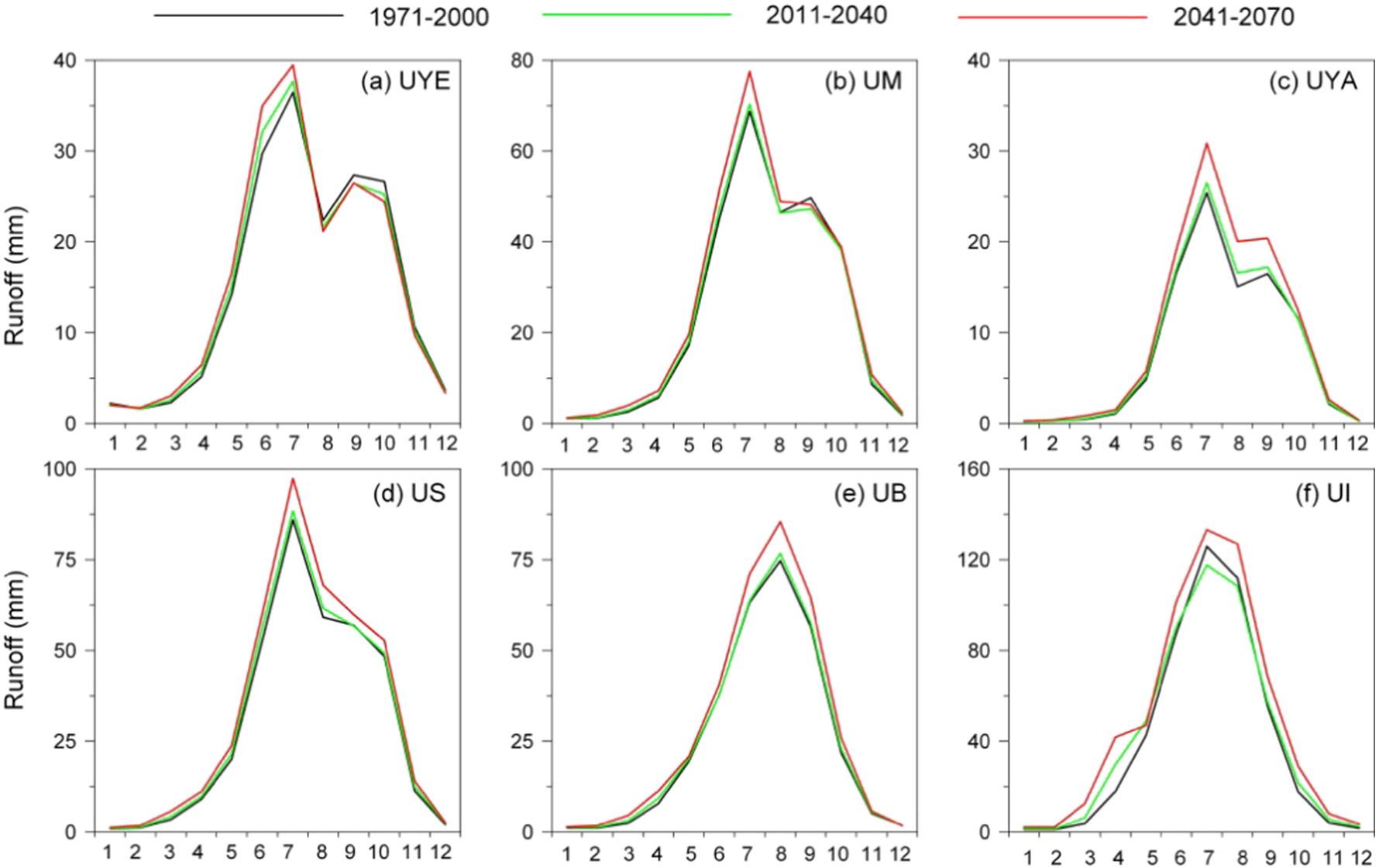 图3 青藏高原六大源区总径流在RCP8.5情景下1971-2000、2011-2040和2040-2071时段的季节分配 |