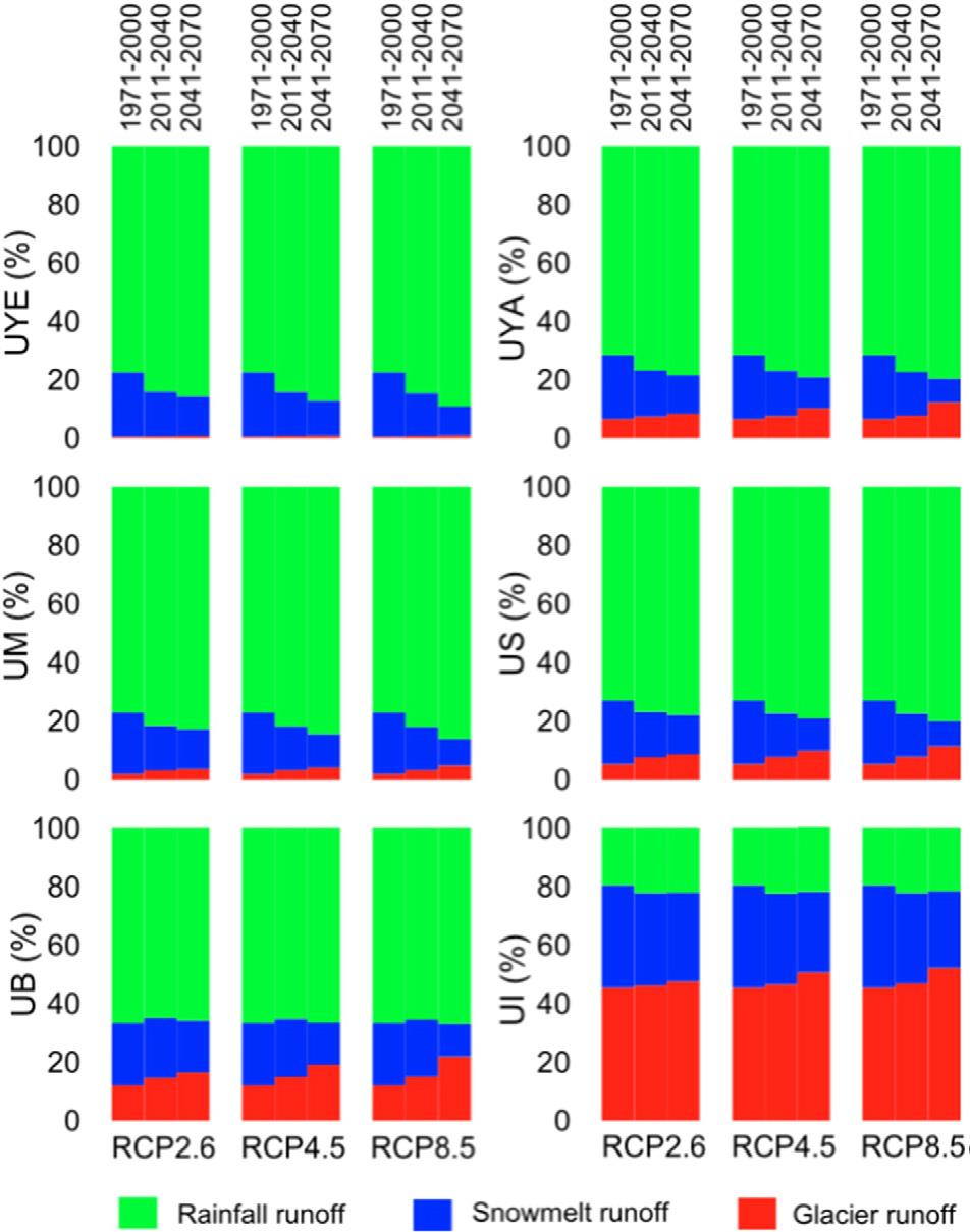 图2 青藏高原六大河源区降雨径流、融雪径流和冰川径流在各情景下对总径流的贡献(%)