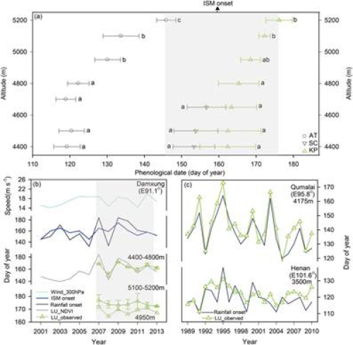 图1. (a) 当雄高寒草甸三个优势物种展叶期比较及其海拔分异;(b) 当雄高山嵩草展叶期的年际变化及其与季风爆发和雨季来临时间、300hPa高空风速的关系;(c) 青海曲麻莱和河南高山嵩草展叶期的年际变化及其与雨季来临时间的关系