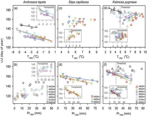 图2. 当雄高寒草甸三个优势物种展叶期与返青前30/60天平均气温和降水的关系。(a-b)垫状点地梅,(c-d) 丝颖针茅,(e-f) 高山嵩草。内插图为移植实验数据。