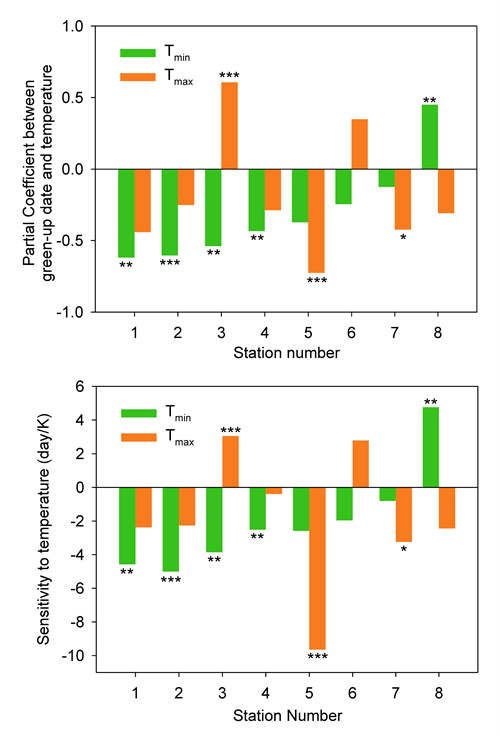 图一,地面观测植物返青期对夜间温度(Tmin)和白天温度(Tmax)的响应。