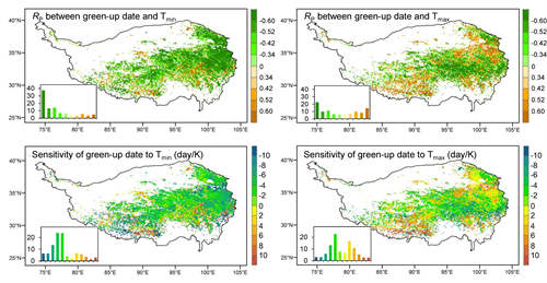图二,基于遥感数据的植被返青期对夜间温度(Tmin)和白天温度(Tmax)的响应。RP为偏相关系数。