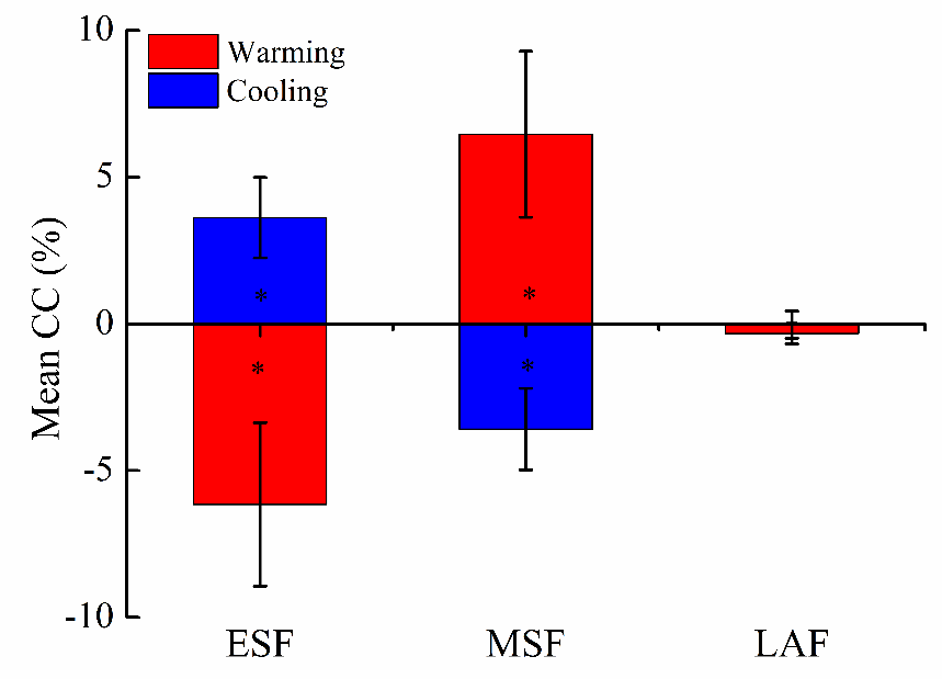 表1 不同花期功能群植物的盖度变化与物候序列变化的相关性。CCESF、CCMSF和CCLAF分别表示早花、中花和晚花功能群植物的盖度变化。Warming为增温(下移),cooling为降温(上移),Pooled为warming + cooling。