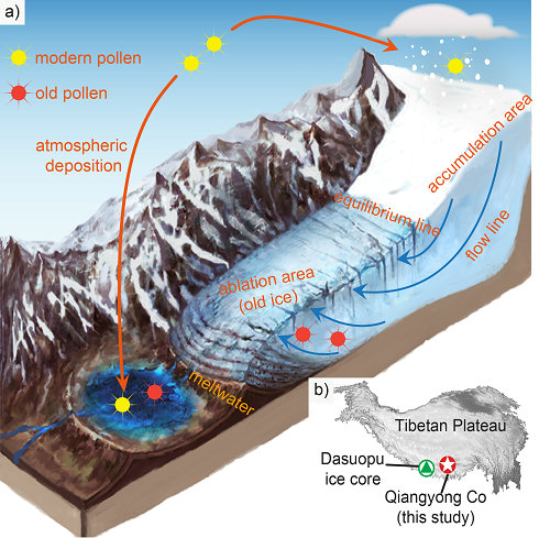 图 1 冰前湖孢粉沉积概念模型及研究区位置