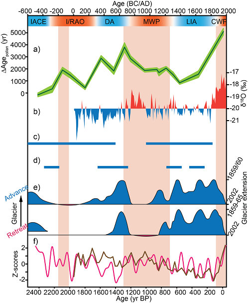 鉴于此,中国科学院青藏高原研究所、地球科学卓越创新中心徐柏青研究员及其博士后张继峰与来自北京大学等单位的合作者,对高原南部枪勇冰川冰前湖沉积物进行了多方法(植物残体、孢粉浓缩物、全有机质)放射性碳测年,提出了一个重建古冰川融化强度的新指标(“老孢粉效应”,即沉积物孢粉年龄与沉积物真实年龄的差值)。依据该研究提出的概念模型(图1),现代孢粉通过大气干湿沉降进入冰川积累区,并随着冰川流动逐渐变成老孢粉储存在消融区的老冰之中,冰川的加速融化会释放更多的老孢粉进入冰前湖。本研究重建了该地区2500年的冰川融化历史(图2),与达索普冰芯氧同位素记录以及青藏高原、欧洲的古冰川记录等具有较好的一致性(图3),说明北半球温度、西风环流活动可能是高原季风区冰川晚全新世百年尺度波动的主控因素。对比发现,近代的冰川融化强度达到过去2500年以来最强,超过了历史上的中世纪暖期和罗马暖期。