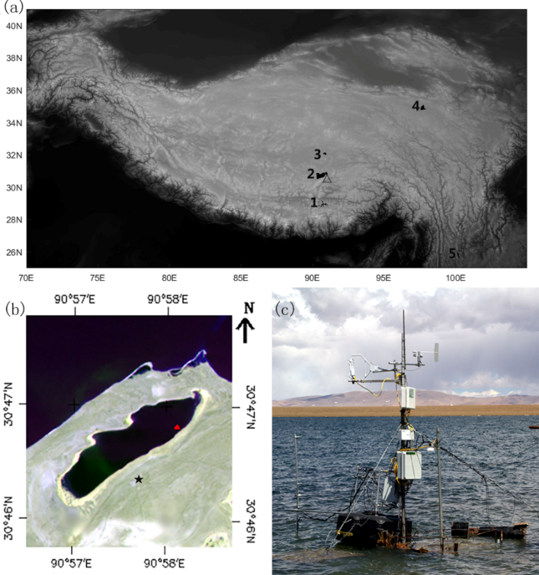 Figure 1 (a) The positions of several high-altitude lakes, with numbers 1-5 indicating the positions of Yamdrok Yum Co, Nam Co, Zige Tang Co, lake Ngoring, and Erhai, respectively; (b) an image of the small lake and the location where field observations were collected; (c) the photo of the instruments.