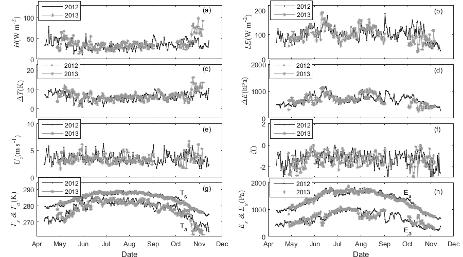 Figure 2 Variation of daily (a) H, (b) LE, (c)Δ T, (d) ΔE, (e) U_z, (f) ζ , (g) T_s&T_a and (h) E_s&E_a in ice-free periods of 2012 and 2013.