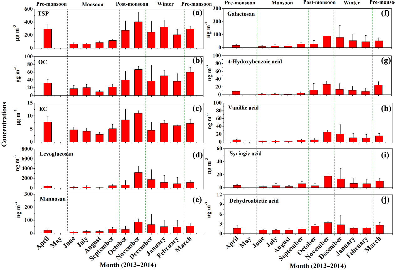 生物质燃烧是大气碳质气溶胶和温室气体等的最主要来源之一,能够显著影响区域乃至全球尺度的大气化学组成。青藏高原毗邻的南亚、东南亚和中亚等地区是北半球生物质燃烧最强烈的区域之一。生物质燃烧不仅对当地气候、环境和人体健康产生干扰,还可以通过大气环流对青藏高原冰冻圈产生深刻影响。由于缺乏系统的观测,南亚生物质燃烧的基本特征和来源尚不明确。 2017年7月21日,Atmospheric Chemistry and Physics 发表了中国科学院青藏高原研究所、西北生态环境资源研究院(筹)以及国际山地发展研究中心等合作研究成果 “Organic molecular tracers in the atmospheric aerosols from Lumbini, Nepal, in the northern Indo-Gangetic Plain: influence of biomass burning”, 对印度河-恒河平原代表性区域的尼泊尔蓝毗尼大气总悬浮颗粒物(TSP)进行了有机分子标志物的全面分析,明确了有机碳(OC)、元素碳(EC)、左旋葡聚糖(levoglucosan)、半乳聚糖(galactosan)、甘露聚糖(mannosan)、对羟基苯甲酸(p-hydroxybenzoic acid,)、香草酸(vanillic acid)、丁香酸(syringic acid)和脱氢松香酸(dehydroabietic acid)的浓度水平、季节变化,估算了生物质燃烧对有机碳的贡献,判断了其可能的来源。 研究发现,蓝毗尼地区的有机碳、元素碳、左旋葡聚糖、半乳聚糖、甘露聚糖、对羟基苯甲酸、香草酸、丁香酸和脱氢松香酸均在秋季(post-monsoon)呈现出高值,而夏季(monsoon)最低(图1)。该地区的左旋葡聚糖含量与南亚受生物质燃烧影响严重地区的浓度水平相当,说明生物质燃烧对蓝毗尼地区的大气环境产生了重要影响。蓝毗尼大气气溶胶中的有机碳、元素碳和左旋葡聚糖具有显著的相关关系,说明生物质燃烧是该地区高浓度碳质组分的主要来源。左旋葡聚糖/甘露聚糖(lev/man)和香草酸/丁香酸(van/syr)的比值结果表明该地区生物质燃烧的种类主要是农作物残余和硬木的燃烧。通过估算得到,秋季生物质燃烧来源对OC的贡献达到41.0% ± 31.1 %, 在11月甚至达到58.7% ± 21.7%(图2)。结合MODIS火点分布情况(FIRMS)和HYSPLIT反向气团轨迹,蓝毗尼地区春季(pre-monsoon)生物质燃烧的来源主要是当地的小麦秸秆燃烧,秋季(尤其是11月)主要受印度西北部和巴基斯坦东部(旁遮普省)水稻秸秆大面积燃烧的长距离传输影响(图3)。而在冬季,当地大量的用于家庭做饭和取暖的生物质燃料燃烧以及静稳的天气情况不利于污染物的扩散,共同导致了蓝毗尼地区严重的大气污染。 这一成果对于研究南亚地区大气污染及其对居民健康影响具有重要意义,消除南亚地区的空气污染不仅是局地也是不同地区和国家的共同责任。所得认识有助于合理制定相关治理政策(改变农业方式,转换清洁燃料或推广先进的炉灶等), 同时也为研究南亚大气污染物向青藏高原传输提供了重要源区特征数据。 研究论文的第一作者为万欣博士生,通讯作者为丛志远和康世昌研究员,野外工作得到SusKat项目和蓝毗尼国际研究所的大力支持,获得了国家自然科学基金(41522103, 41421061)、冰冻圈科学国家重点实验室基金(SKLCS-ZZ-2015)和日本学术振兴会项目(24221001)的资助。 论文链接:https://www.atmos-chem-phys.net/17/8867/2017/