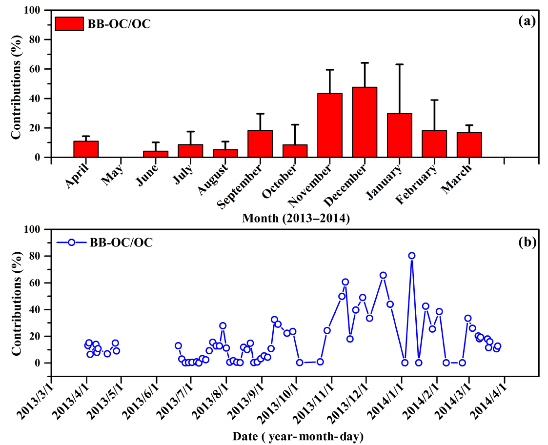 图2 蓝毗尼地区生物质燃烧来源对有机碳的贡献(2013年3月-2014年4月)