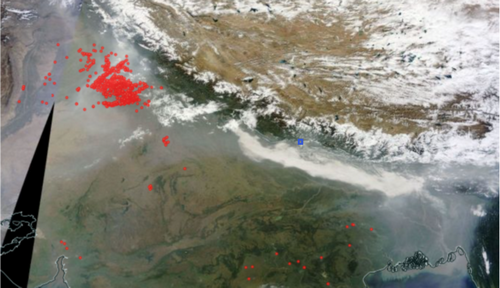 图3. 2013年11月MODIS卫星观测到的南亚上空的烟羽和火点(蓝框代表蓝毗尼) |