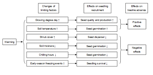 图1. 气候变暖导致的限制因子变化对幼苗定居和林线上升的影响