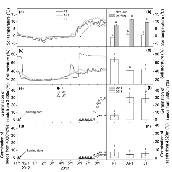 图3. 不同移植地点间土壤温度和水分(a & c: 2012.11-2013.8数据, b & d: 2006-2015平均值)及冷杉种子萌发率(e-h, 采自分布中心3800 m和林线4320 m)的差异。不同字母表示不同地点间存在显著差异(P < 0.05)。FT:冷杉林线,AFT:冷杉林线以上,JT:方枝柏林线。