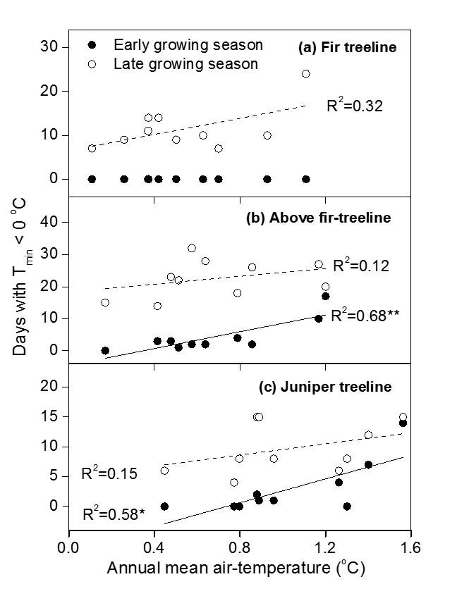 图5. 生长季早期(5-6月)和晚期(9-10月)的冻害事件频率与年平均气温之间的关系(a冷杉林线,b冷杉林线以上,c方枝柏林线)。 |