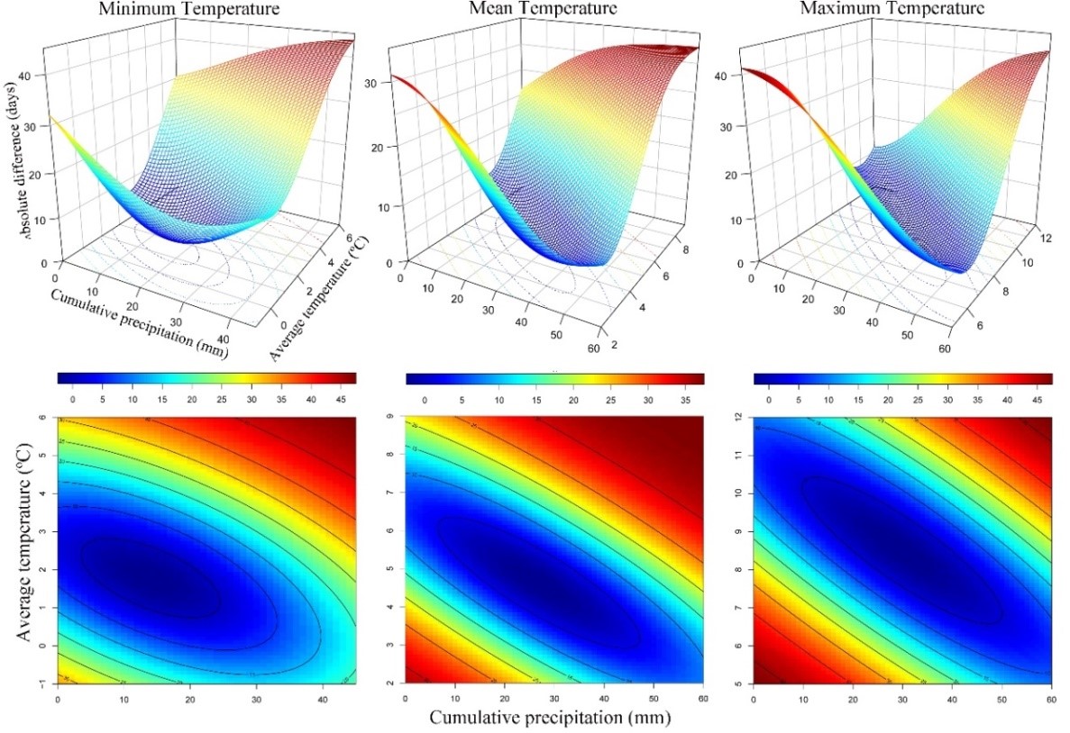 图2. 时窗长度为12天时观察到的木质部发生日期与给定日期间(由特定的平均温度和累积降水量决定)差异的二维高斯模型的曲面图及其对应的水平集 |