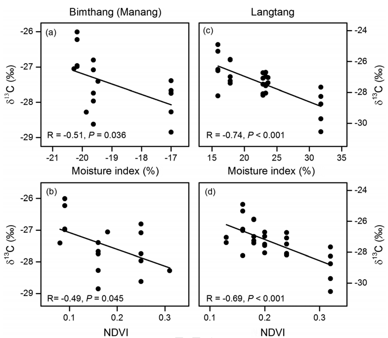 图4:两种垫状植物Androsace muscoidea (Bimthang, Manang)和Androsace lehmannii (Langtang)的叶δ13C比值与生长季(6-9月)湿润指数和NDVI的关系。叶δ13C比值随着湿润指数的升高(a和c)和NDVI的升高(b和d)而降低。