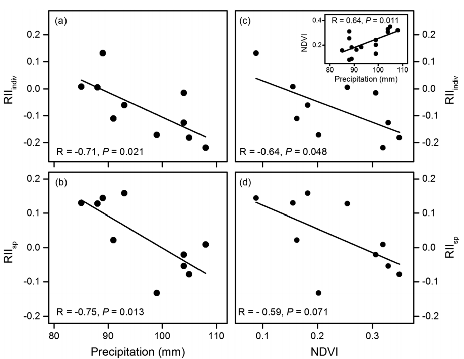 图5:RII与季风前降水(3-6月)(a-b)和NDVI(c-d)的关系(综合3条样带的所有海拔样点)。RIIsp和RIIindiv均与季风前降水和NDVI呈负相关关系(a-d),NDVI和季风前降水呈显著正相关(c,插图)。
