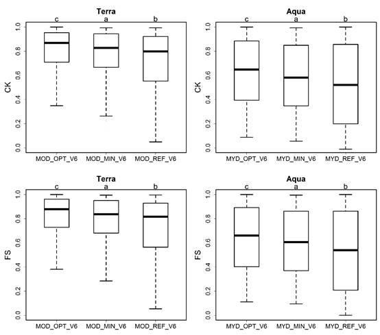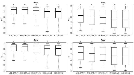 MOD_OPT_V6:NDSI阈值取局部最优值;MOD_MIN_V6:NDSI阈值取0.1;MOD_ REF_V6:NDSI阈值取0.4。CK:Cohen’s Kappa;FS:F-score;上方小写字母代表多重比较结果(0.01显著性水平):含有相同字母表示无显著差异,反之表示具有显著差异。