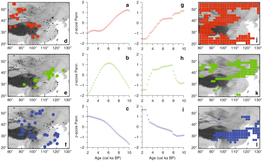 图1 东亚全新世降水变化空间格局。基于孢粉定量重建(a-c)和模型模拟(g-i)的三种降水变化模式具有很高的一致性。两个方法获取的三种模式在空间上的分布特征(基于孢粉,d-f;基于模型,j-l)也存在一致性。 |