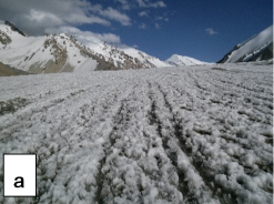 图1消融季冰川表面出现冰尘聚集(a)和野外冰尘采样(b)