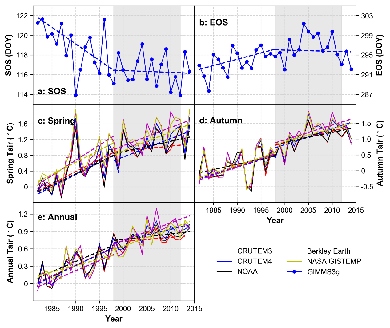 图1 1982年至2014年期间北半球(纬度≥30°)物候期和温度的变化趋势。a是采用遥感估算的生长季开始时间(SOS)的变化趋势;b是采用遥感估算的生长季结束时间(EOS)的变化趋势;c 北半球春季平均温度的变化趋势; d北半球秋季平均温度的变化趋势; e全球陆地平均温度变化趋势。遥感物候估算采用了五种常用的物候估算模型,图a和b中是五种模型的平均值。温度数据选取了五套IPCC报告中用于评价全球变暖的数据集,分别是CRUTEM3.0、CRUTEM4.6、NOAA、 Berkley Earth和 NASA GISTEMP。图中虚线表示采用Mann–Kendall方法计算的线性趋势。图中灰色阴影部分表示Warming Hiatus时段。