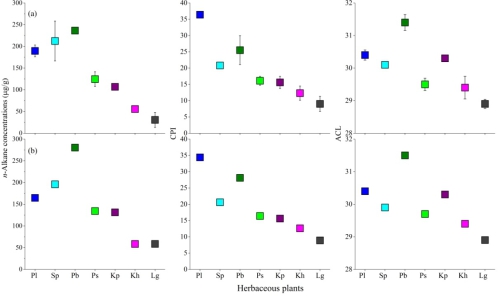 图2. 2015年那曲增温实验平台(a)对照样地和(b)所有控制生长条件样地开顶室中七种草本植物叶蜡正构烷烃含量,及其CPI和ACL分布对比图. Pl:草地早熟禾;Sp:紫花针茅;Pb:二裂委陵菜;Ps:钉柱委陵菜;Kp:小嵩草;Kh:矮嵩草;Lg:兔耳草.