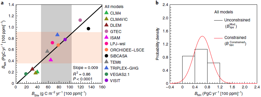 图1 基于野外CO2施肥实验观测约束的北温带陆地生态系统碳汇对CO2升高的敏感性。