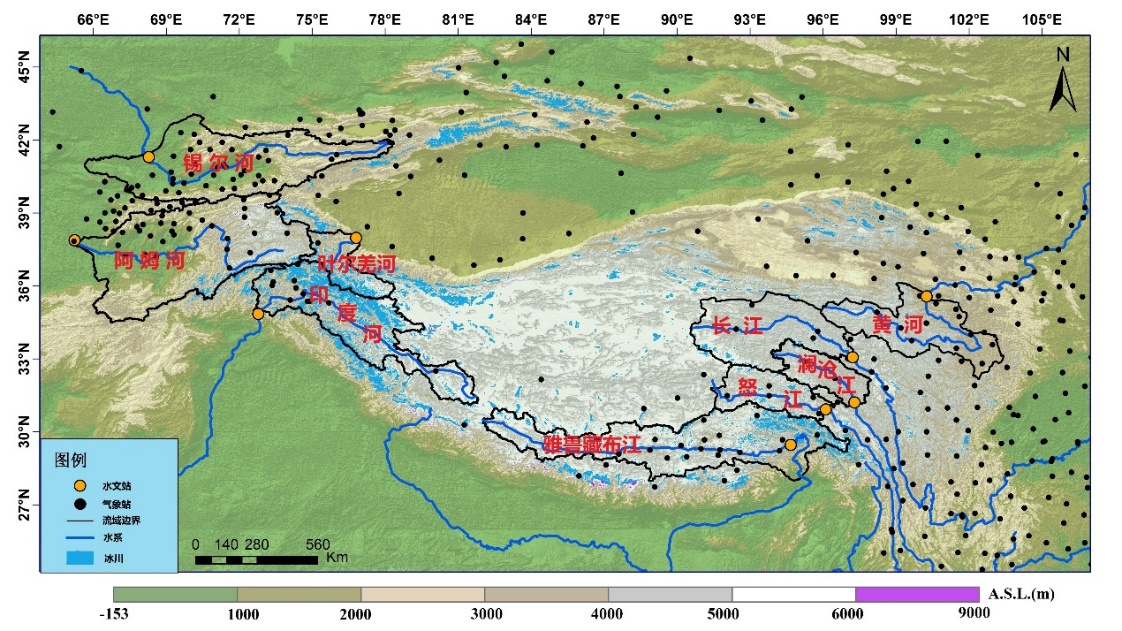 以青藏高原为核心的第三极地区是长江、黄河、澜沧江、怒江、雅鲁藏布江、印度河、阿姆河、锡尔河和塔里木河等主要大江大河的发源地,为下游20多亿人口提供水安全,同时也是地球上两大环流—季风和西风交汇碰撞并严重影响人类生存环境的区域。降水是水循环的关键组成部分,也是水文模型模拟陆面水文过程的重要输入。模型结果的可靠性很大程度依赖于降水等气象输入的准确性。第三极地区海拔高、地形复杂,长时间序列的气象观测站点稀少且主要集中在东部低海拔地区(图1),为该区域水文模拟研究带来很大挑战。已有研究表明,利用降水梯度将低海拔站点数据插值到高海拔区域,是反演高海拔区域降水数据的一个有效方法。然而,第三极地区地形复杂,高原热力作用、大尺度环流及高原局部环流等机制并存,降水的地形效应在不同地区也有所变化。因此,西风-季风作用下第三极流域源区降水和地形的关系及其影响机制是什么,是否可以通过降水地形校正来准确推算高海拔区域降水,从而满足第三极流域水文模拟的精度要求?