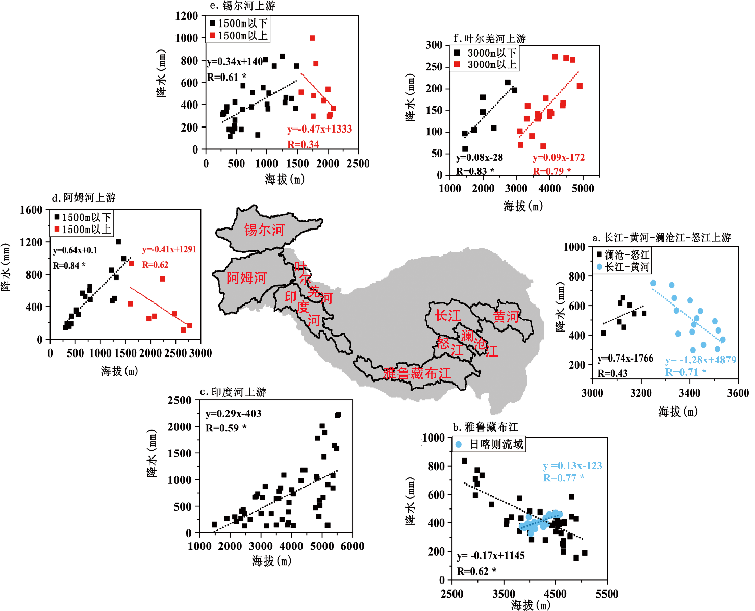 图2 第三极9条河流源区流域年均降水量和海拔关系 (*表示在95%的置信水平)