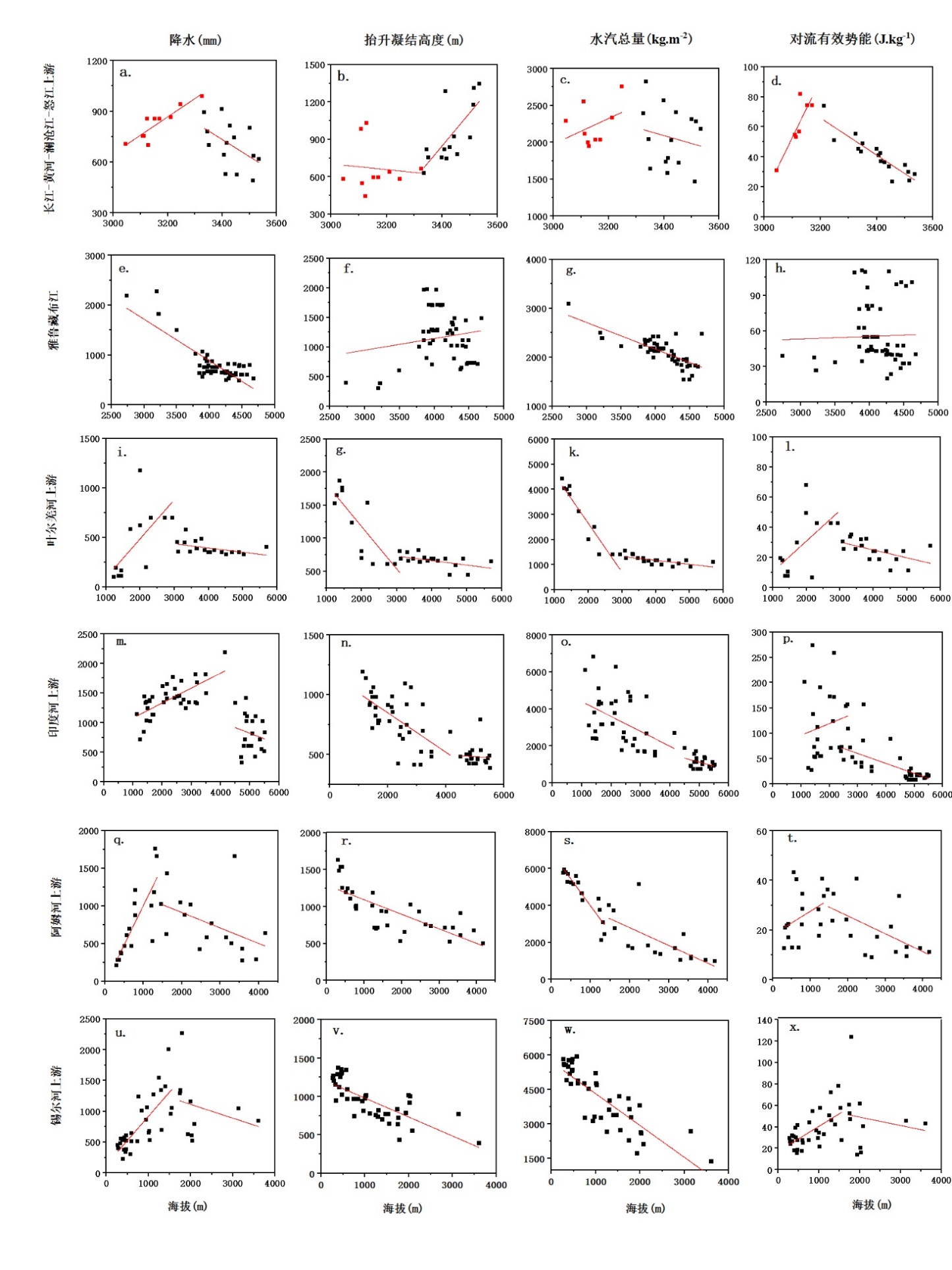 图3 ERA5数据中降水、抬升凝结高度、水汽总量、和对流有效势能在第三极9条主要河流源区随高程变化特征
