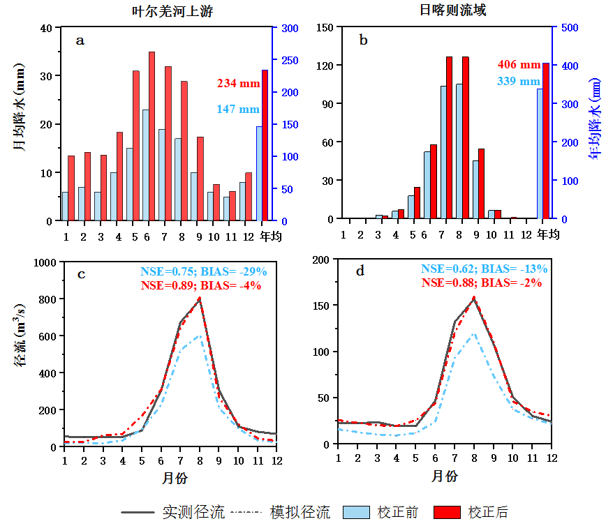 图4 叶尔羌河上游、雅鲁藏布江日喀则流域校正前后的降水(a, b)和模拟的径流(c, d)