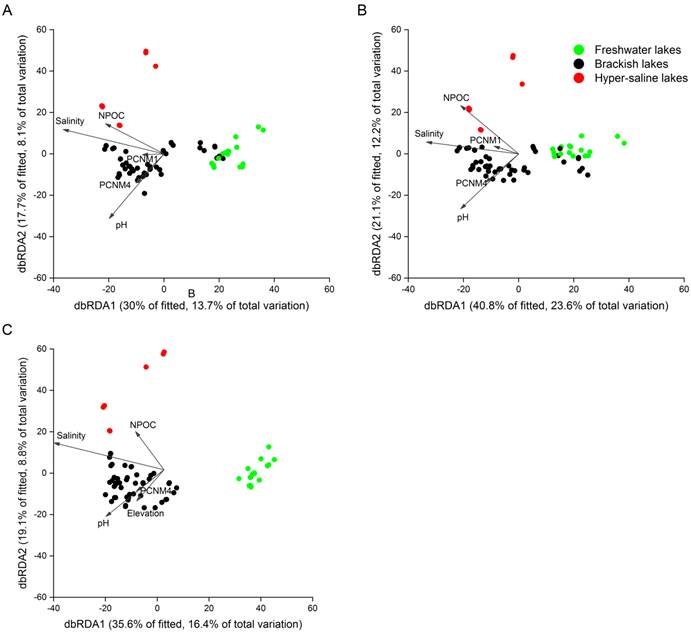 图2 细菌在淡水湖(A)、咸水湖(B)及超盐湖(C)的群落结构及驱动因子