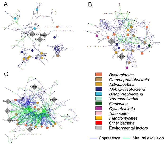 图3 细菌在淡水湖(A)、咸水湖(B)及超盐湖(C)的共生网络结构图