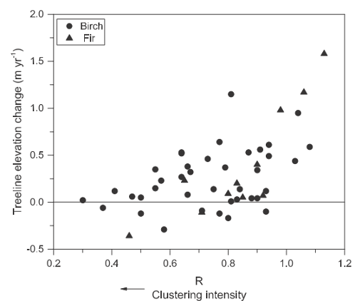 图3. 集群强度(clustering intensity值越小,强度越大)与树线上升速率的关系