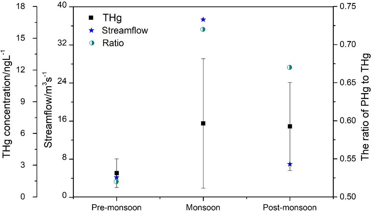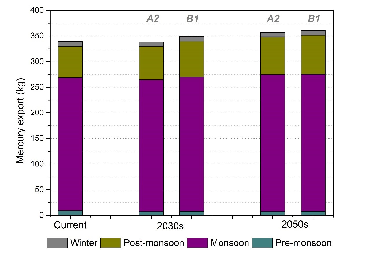 基于此,中国科学院青藏高原研究所、青藏高原地球科学卓越创新中心张强弓研究员等对典型的跨喜马拉雅河流—柯西河流域在不同季节开展系统的采样观测。研究发现柯西河流域水体汞含量具有显著的季节差异,不同季节水体汞含量依次为,季风后期>季风期>季风前期(图1)。不同季节河流水体中均以颗粒汞为主,是影响汞分布的主要因素。水体总汞含量、径流量以及颗粒态汞与总汞的比值变化同步且具有相似的季节变化趋势。这表明径流控制下,悬浮颗粒物变化和输出是影响流域汞输出的重要因素(图2)。基于流域径流量模拟值和水体总汞含量,研究人员估算了不同季节柯西河径流汞输出量,依次为,季风期(259.47 kg)>季风后期(61.18 kg)>冬季(9.31kg)>季风前期(9.08 kg)。在气候环境变化背景下,预计未来每年的径流汞输出量呈增加趋势,季风后期增加更为明显(图3)。
