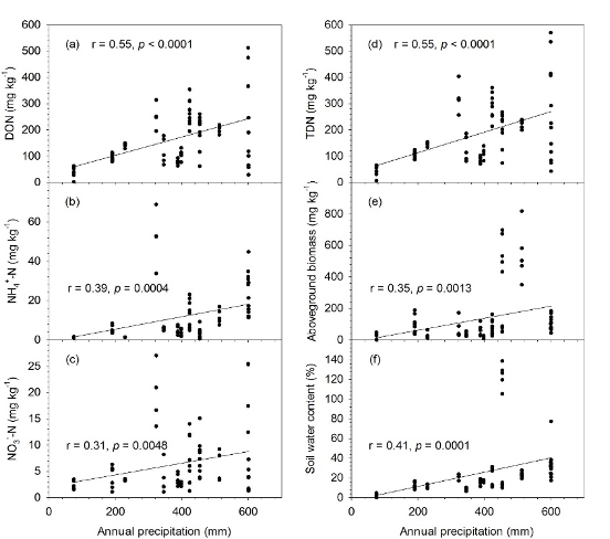 图2. 土壤可溶性有机氮、土壤全氮、土壤铵态氮、硝态氮、土壤含水量和植物地上生物量与年平均降雨量相关分析