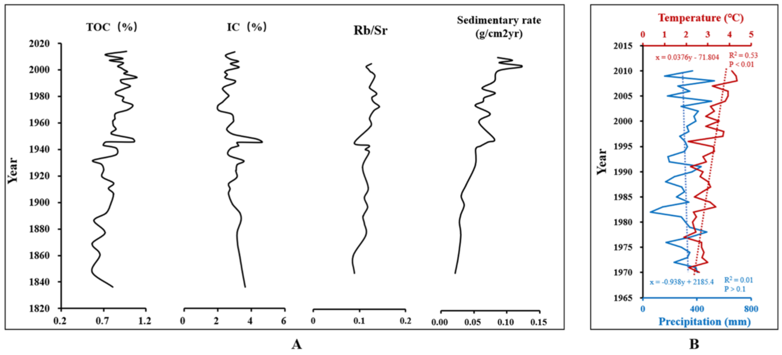 沉积物的地球化学指标(TOC、IC、Rb/Sr和沉积速率)和本地气象数据(图1)均表明,枪勇错在过去两个世纪里呈持续变暖的趋势,导致冰川融化加剧、侵蚀加强,枪勇错沉积速率增加。
