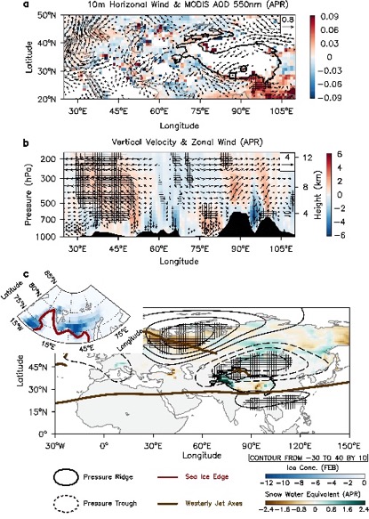 在全球变暖背景下,北极海冰加速融化。通过统计诊断分析发现,2月北大西洋一侧北极海冰减少,使得该地区海洋表面和大气底层异常增暖,北极和中纬度大气温度梯度减少。根据热成风原理,该地区极地急流减弱,向高纬度欧亚大陆内陆输送暖、湿的海洋气流减少,导致2至4月乌拉尔山附近积雪深度减少,进而影响4月西风带大尺度扰动,东亚副热带西风急流增强。受青藏高原地形影响,增强的上升气流与青藏高原山谷风等中尺度环流系统相结合,加速南亚污染物翻越喜马拉雅山脉,进入青藏高原。