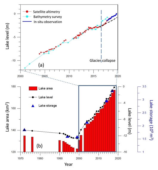特别重要的发现是,随着后期冰崩体的融化,2016-2019年间下游美玛错湖水水位出现快速上涨,冰体的快速融化对美玛错扩张的贡献达到23%。该成果日前发表于期刊《冰冻圈》。